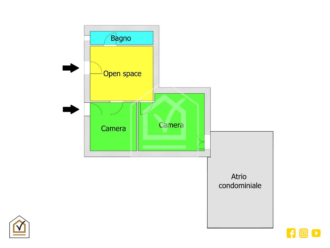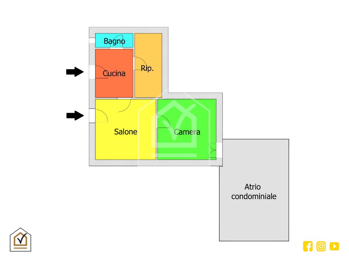 L'immobile si estende su una superficie interna di 80 mq, è in ottime condizioni ed è così composta: ad accoglierci troviamo 2 ingressi, entrambi con cancelletto in ferro, Dal primo abbiamo accesso alla cucina, a seguire troviamo il bagno finestrato, l'utile ripostiglio, il salone illuminato dal secondo ingresso e l'ampia camera da letto con affaccio su atrio condominiale.