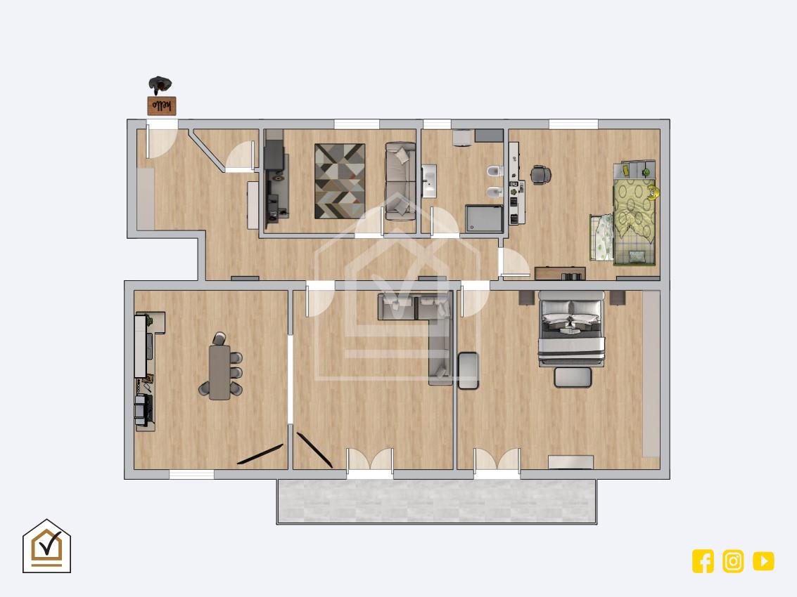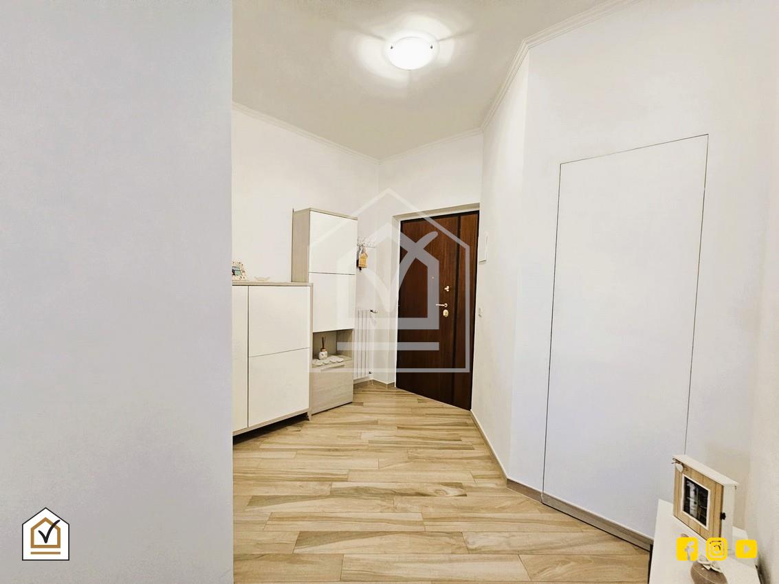 All'ingresso troviamo un comodo ripostiglio con porta filo muro che crea un tutt'uno con l'ambiente; proseguendo si sviluppa la zona giorno ricreata in un ampio e luminoso open space con doppio accesso al balcone. L'intera abitazione è caratterizzata da una pavimentazione in gress effetto parquet dai colori tenui; inclusa vi è la cucina con forno Indesit! Alla zona notte si giunge percorrendo il disimpegno con faretti a led installati nel recente 2023; quest'ultima si compone di due camerette, camera matrimoniale ed il bagno.