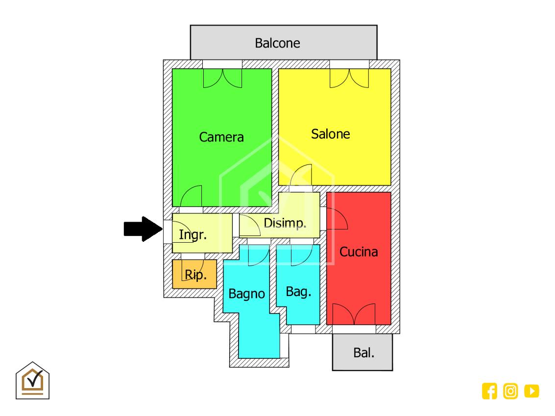 L'appartamento offre un'ottima funzionalità e spazi ben distribuiti: dopo aver varcato l'ingresso verremo accolti da un lungo corridoio che ci condurrà sulla sinistra alla comoda camera da letto e ampio salone; sulla destra troveremo cucina abitabile e doppio bagno entrambi dotati di finestra. Infine, a completare l'intera soluzione è l'utile ripostiglio.