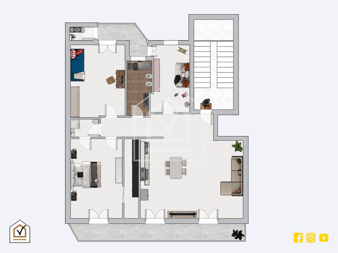 Dopo aver varcato l'ingresso, verremo accolti da un piacevole open-space di ben 30 mq, in cui troviamo salone e cucina, arricchiti da un elegante controssofittatura in faretti, dotato di comodo e spazione balcone con affaccio su via Montegrappa; proseguendo troveremo sulla destra due spaziose camere da letto, bagno padronale con doccia e utile ripostiglio da adibire, anche, a zona lavanderia, completo di balcone con affaccio interno. Infine si completa con camera-suite composta da scenografica cabina armadio e bagno in camera con vasca. Tuttavia l'intera proprietà immobiliare è valorizzata da un pavimento rivestito di gress porcellanato effetto marmo, che aggiunge un tocco di eleganza ad ogni ambiente.