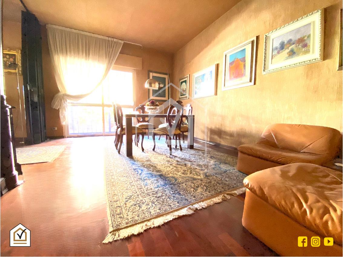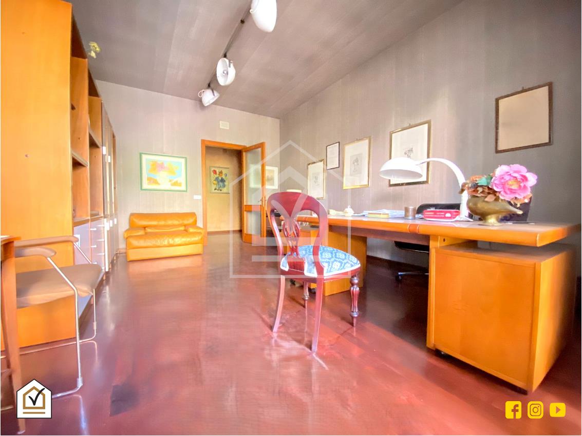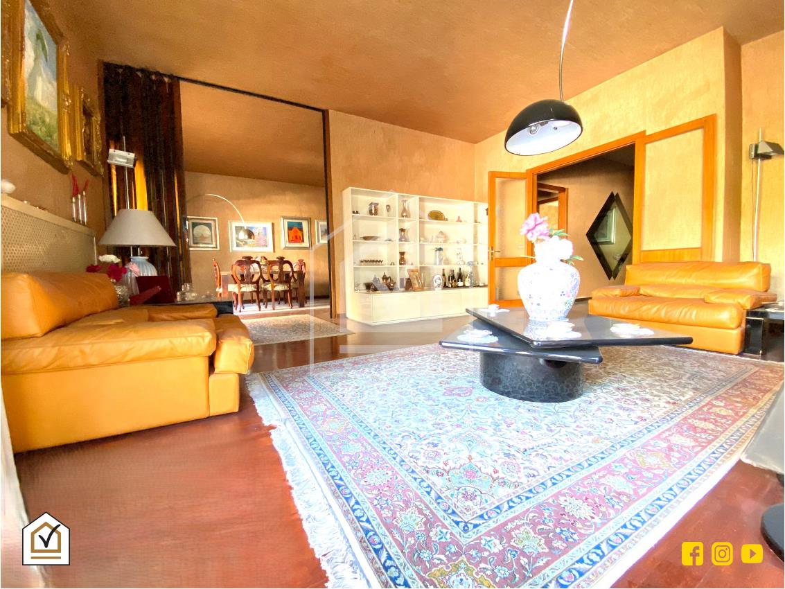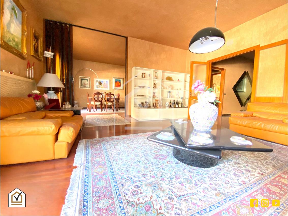 Gli spazi proseguono con una sala da pranzo distinta e una cucina abitabile, entrambe collegate in maniera fluida ma ben definite nella loro funzione, ideali per la convivialità e la vita quotidiana. La zona notte è composta da tre ampie camere matrimoniali, silenziose e ben disimpegnate, oltre a due bagni finestrati rifiniti con materiali di qualità e dal gusto sobrio. La disposizione planimetrica, razionale e armonica, consente facilmente una rimodulazione degli ambienti in base alle esigenze abitative o professionali.