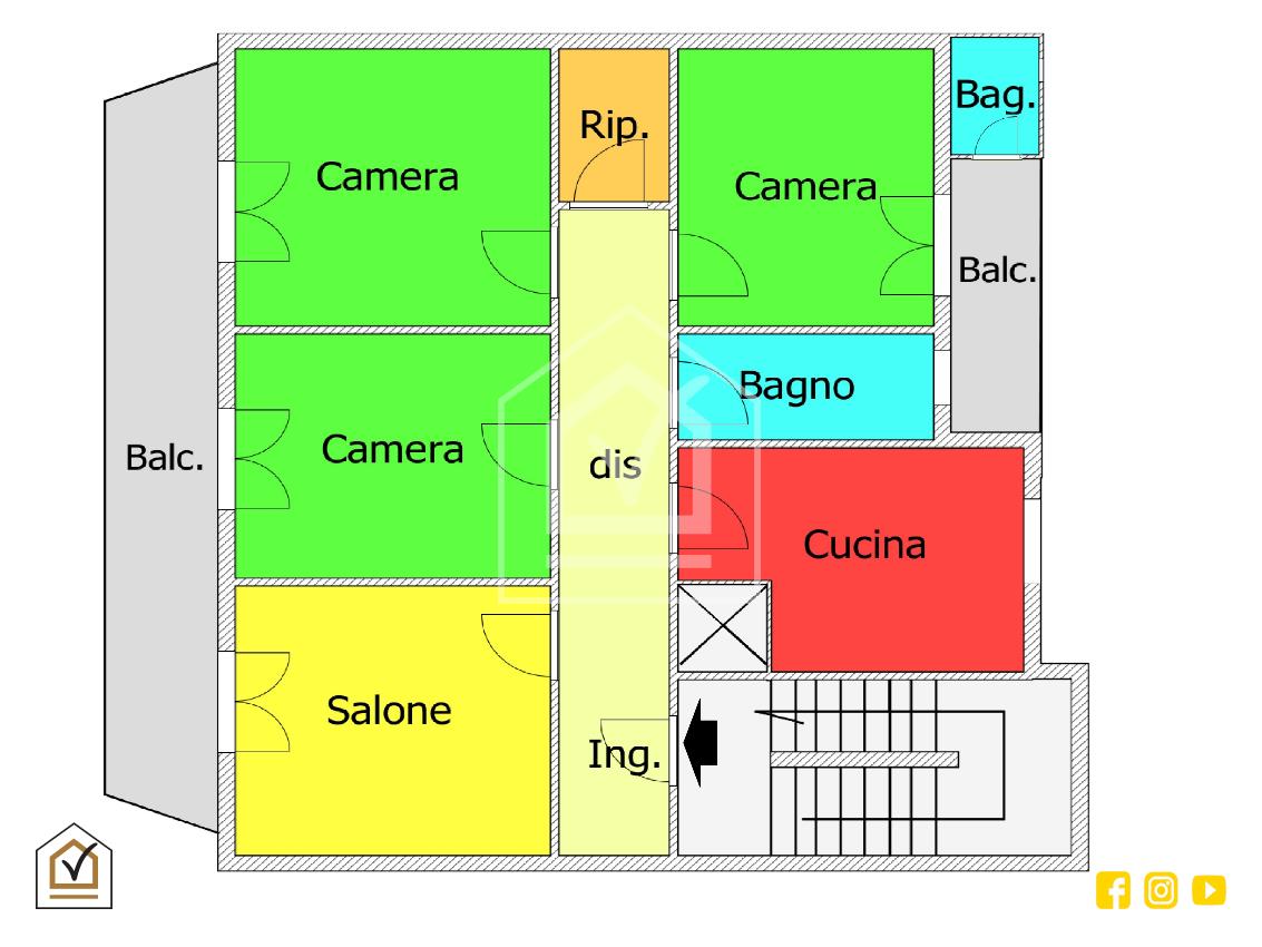 La proprietà presenta una zona giorno costituita da ingresso, luminoso salone, cucina abitabile e disimpegno che conduce alla zona notte con tre camere da letto e utile rispotiglio. Tutti gli ambienti risultano ariosi e pieni di luce grazie alla presenza di due balconi rispettivamente con affacio interno ed esterno.