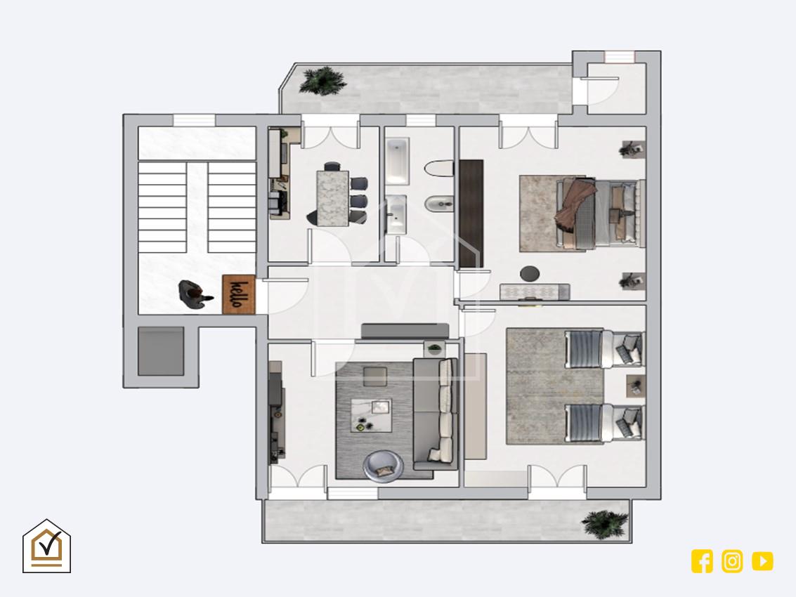 E' dotato di doppia esposizione su ampi balconi ed è così composto: ingresso in disimpegno con a destra l'accesso al salone e alla prima camera da letto che affacciano entrambi sul balcone esterno; a sinistra invece si sviluppa la restante parte dell'appartamento che ha accesso al balcone interno ed è composta da cucina, bagno e camera da letto matrimoniale.