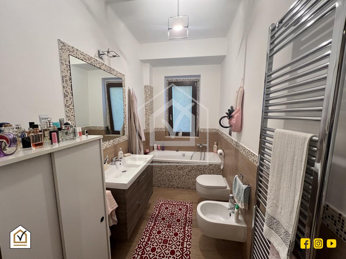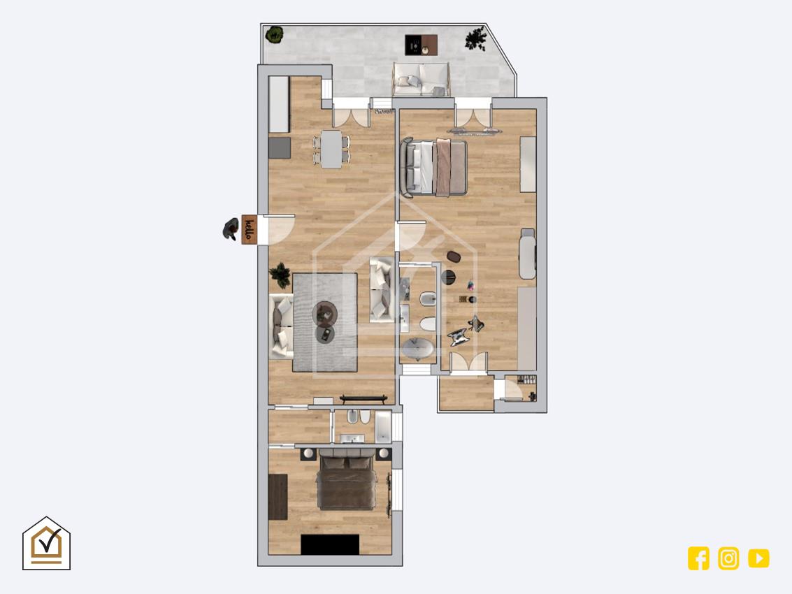La soluzione è composta da ingresso nell'ampio salone, sulla sinistra avremo la cucina che completa un ambiente unico e luminoso visto l'accesso al terrazzo a livello, dal quale si potranno condividere pranzi o cene all'aria aperta con la propria famiglia o con i propri amici godendo di una piacevole vista. Sul terrazzo si avrà accesso anche alla camera da letto provvisto di bagno e balcone con affaccio interno e ripostiglio; proseguendo lungo il disimpegno, invece, potremo accedere al secondo bagno e alla camera da letto padronale.
