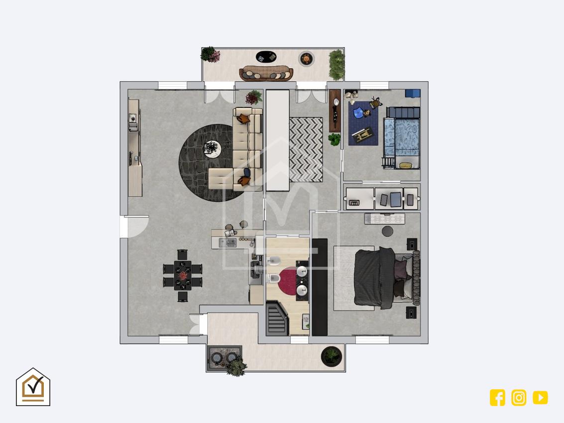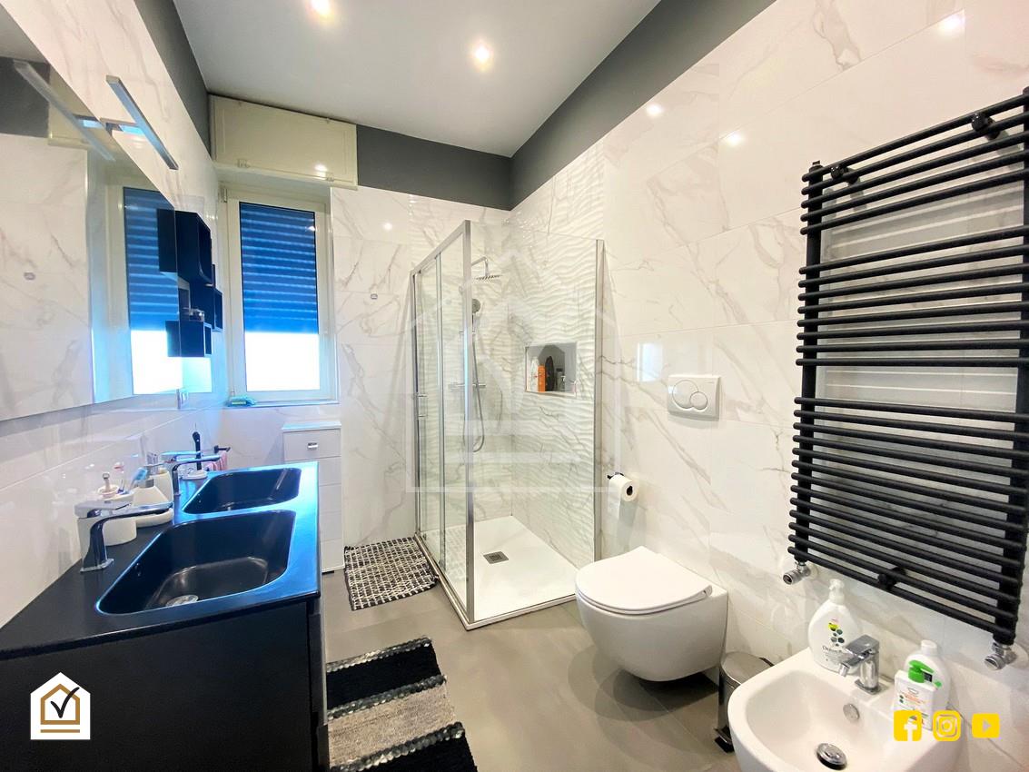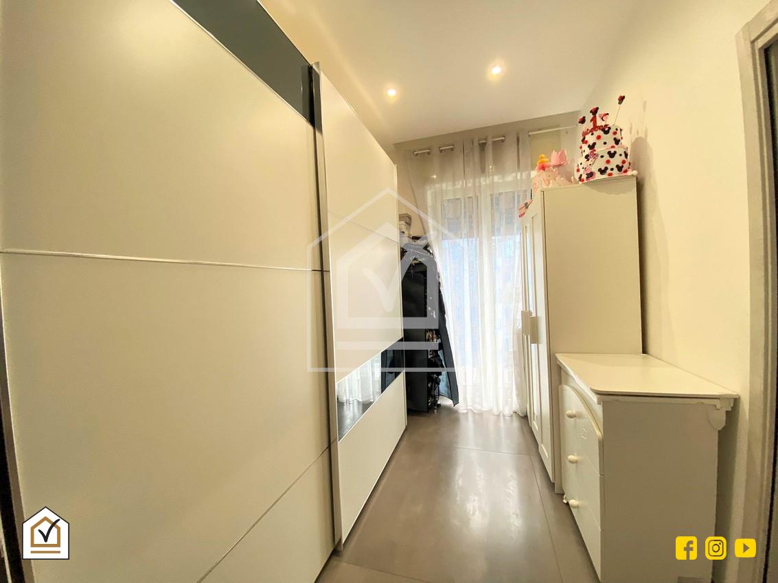 La soluzione è situata al 3° piano in stabile in buono stato sprovvisto di ascensore, e si distribuisce in maniera estremamente lineare grazie alla presenza dell'ariosa zona giorno sui due lati, questa composta da soggiorno con elegante controsoffittatura LED e cucina a vista con penisola, ampio disimpegno con armadio a muro con spazio sufficiente per ricavare, qualora necessario, una terza camera da letto, bagno padronale finestrato dotato di box doccia ed infine le 2 camere da letto, di cui una con utile cabina armadio. Completano i due balconi doppia esposizione sviluppati su 25 mq circa complessivi, su uno vi possiamo trovare un'utilissima zona lavanderia.