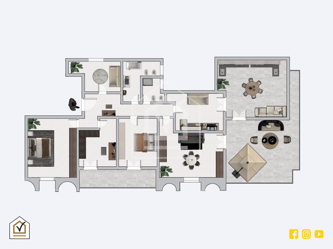Varcando la porta d'ingresso si è accolti dalla zona notte che si compone di quattro camere da letto di ampie dimensioni e dal doppio servizio finestrato; proseguendo il disimpegno si giunge alla zona giorno composta dalla cucina e dal salone. Entrambe le stanze riversano nell'ampia veranda a livello, ottimo spazio da utilizzare per godersi momenti di svago all'aria aperta senza rinunciare alla comodità di abitare in città.