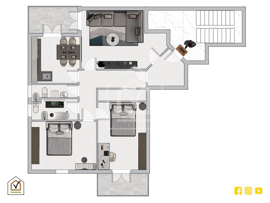 L'abitazione si compone di un ingresso che conduce a un ampio e luminoso soggiorno. La zona giorno è particolarmente spaziosa e perfetta per ospitare una famiglia. Adiacente al soggiorno, troviamo una cucina separata che garantisce un'ottima funzionalità per chi ama cucinare in tranquillità. Entrambi gli ambienti, soggiorno e cucina, hanno l'accesso a un balcone interno, che permette di godere di un'ottima ventilazione e luminosità.