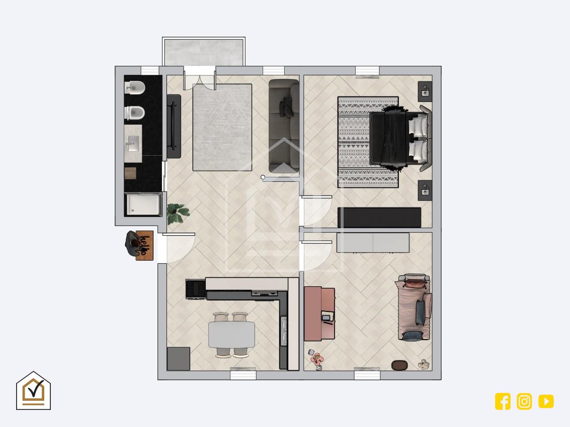 Varcato l'ingresso, ci accoglierà ampio e luminoso open-space con angelo cottura, dal quale si potrà accedere alle due camere da letto e al comodissimo bagno.