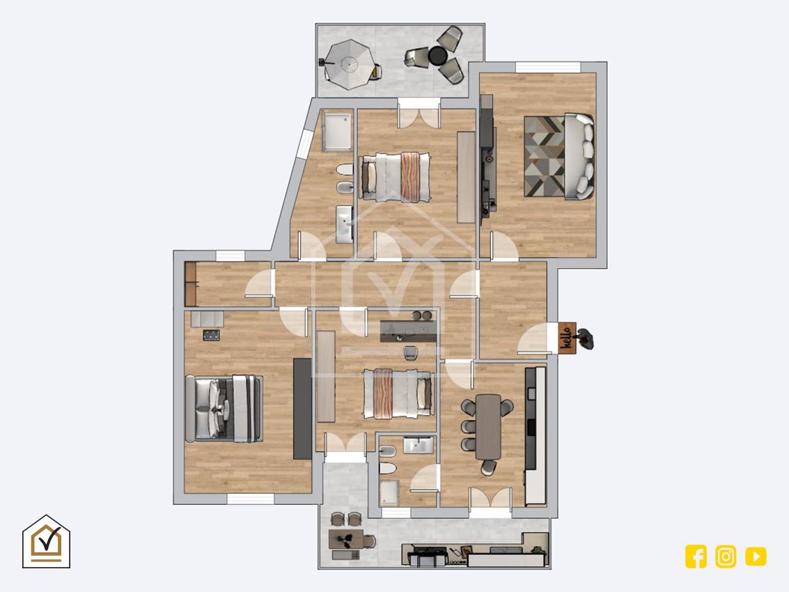 Proseguendo nel corridoio, si accede alla zona notte, che è separata dalla zona giorno, garantendo così una totale privacy e tranquillità. La zona notte è composta da tre ampie camere da letto, ognuna delle quali è dotata di un affaccio esterno che consente alla luce naturale di invadere ogni angolo. Le camere sono spaziose e ben organizzate, ideali per ospitare sia un letto matrimoniale che arredi aggiuntivi, e sono perfette per garantire a ciascun membro della famiglia la giusta privacy e comfort. I due bagni, uno principale e uno di servizio, sono entrambi ampi e ben illuminati, arredati con materiali di qualità e dotati di tutti i comfort necessari.