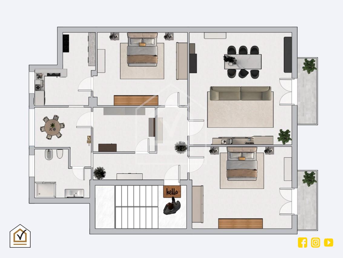 E' così composta: ingresso in ampio disimpegno, salone con affaccio su balcone esterno, due camere da letto, cucina e bagno.