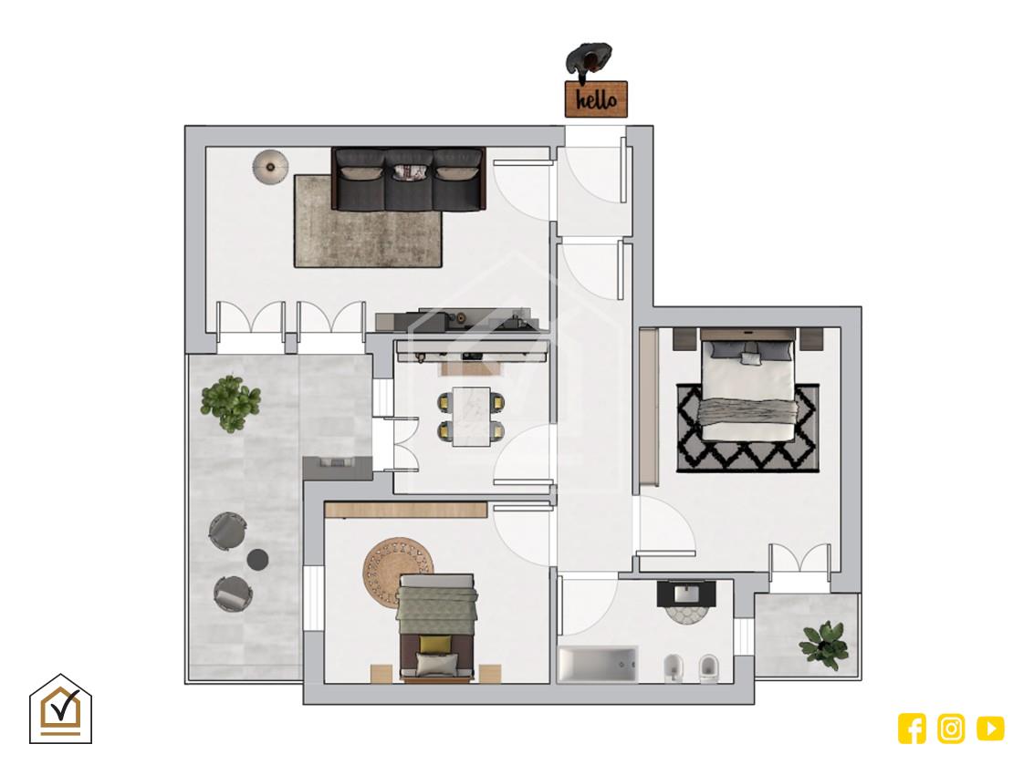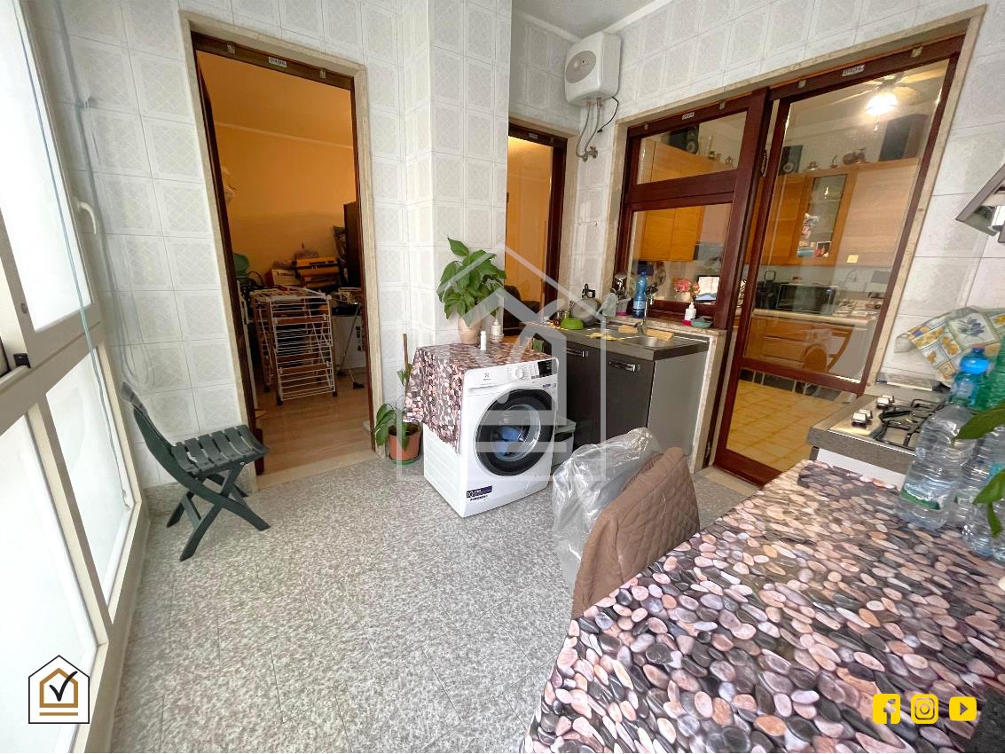 Attualmente è così strutturato: ingresso su disimpegno, che garantisce una distribuzione ordinata degli ambienti, comodo salone, cucina abitabile che affaccia su un ampio balcone verandato, due camere da letto con rispettivo affaccio ed il bagno padronale con vasca.