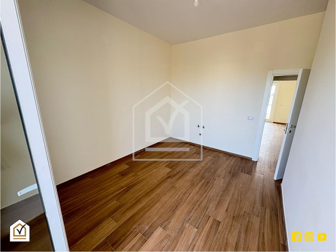 Le finiture dell’immobile rivelano una particolare attenzione al gusto e alla qualità: la pavimentazione in gres porcellanato effetto legno dona continuità visiva e calore agli ambienti; le porte interne in legno dal design moderno, con venature naturali e maniglie satinate, dialogano con la sobrietà delle pareti in tonalità avorio, mentre gli infissi in PVC con vetrocamera e tapparelle coibentate garantiscono isolamento termico e acustico ottimale.