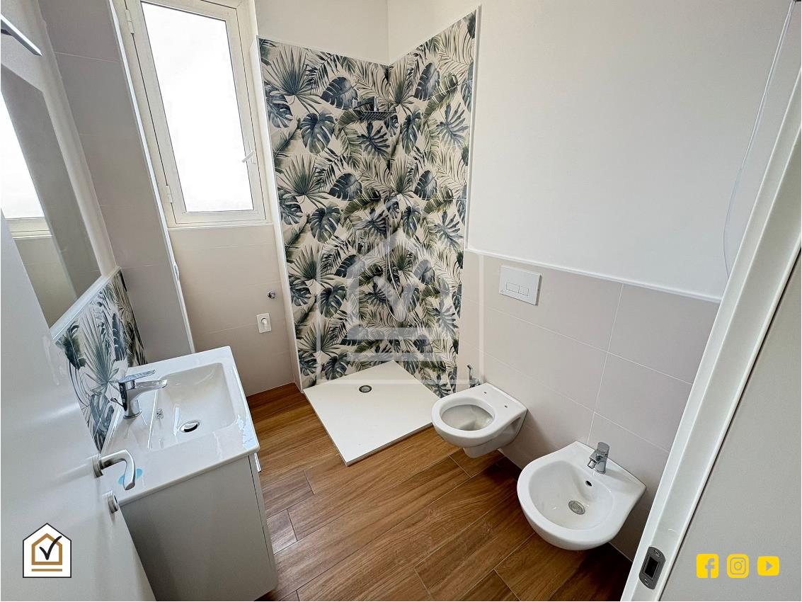 Proseguendo, si raggiunge il bagno, autentico elemento di distinzione dell’intera abitazione. Qui, la parete è impreziosita da un elegante rivestimento decorativo a tema botanico, nei toni profondi del verde e del blu, che richiama suggestioni esotiche con uno spirito raffinato e contemporaneo. Questo pattern, audace ma armonioso, trasforma lo spazio in un piccolo angolo di benessere domestico. Il bagno è inoltre dotato di sanitari sospesi, lavabo d’arredo con specchio retroilluminato e ampio box doccia con vetro trasparente: ogni dettaglio è pensato per coniugare estetica e funzionalità con estrema cura.