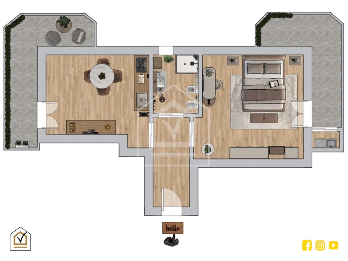 L’abitazione accoglie con un ingresso in disimpegno, dal quale si accede agli ambienti principali. La cucina abitabile, pensata per un utilizzo quotidiano pratico e confortevole, si distingue per la sua vivibilità e per le finiture sobrie e contemporanee. Questo spazio è l’ideale per momenti di convivialità o per una gestione familiare dinamica e ordinata.