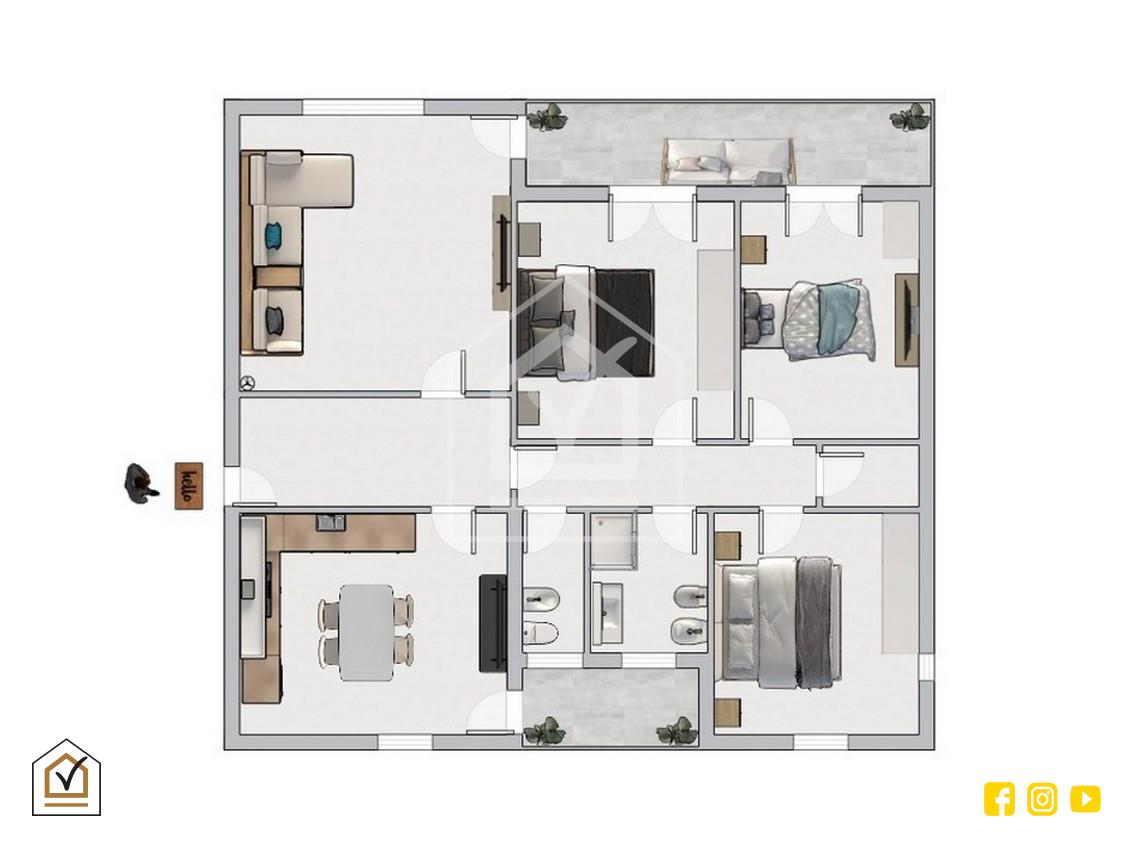 L'appartamento si compone di quattro vani più accessori e offre una distribuzione interna funzionale e accogliente. L’ingresso apre su un ampio salone, ideale per momenti di relax e convivialità, adiacente a una cucina abitabile, comoda e ben organizzata. La zona notte include tre camere da letto, di cui una può essere facilmente adibita a studio, stanza hobby o camera per gli ospiti, in base alle esigenze. Completano la proprietà due bagno, oltre a un comodo ripostiglio.