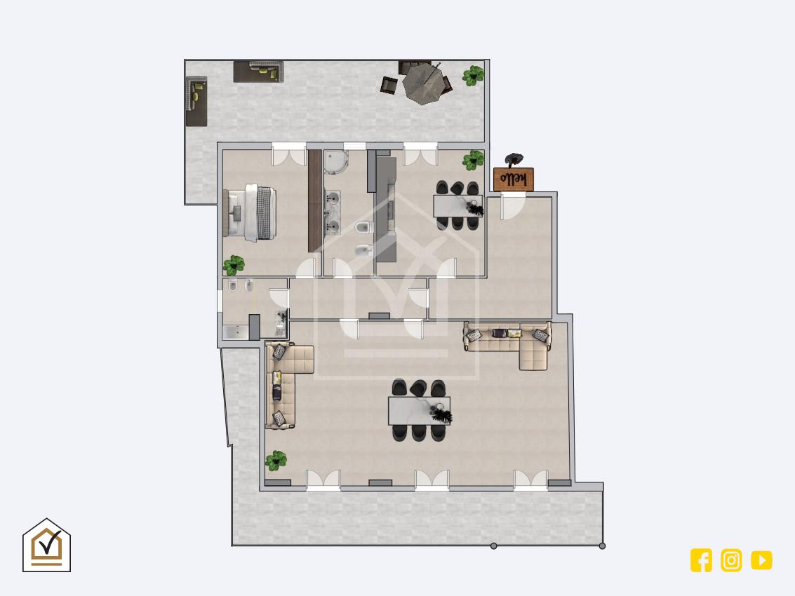 Attualmente utilizzata come studio presenta quindi un salone con triplo accesso al balcone, uno spazio ampio e luminoso che può essere utilizzato per ricreare una seconda camera da letto con annesso salone. Apportando alcune modifiche è possibile ricreare un comodo tre vani e/o per le famiglie piu numerose creare un ampio open space all'ingresso ricavando ben 3 camere da letto.