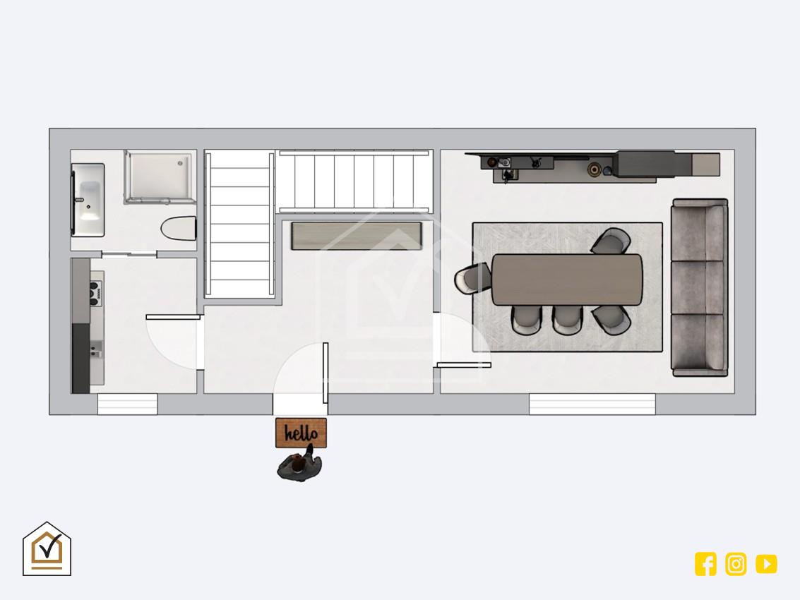 Al piano terra troviamo un'ampia zona living luminosa e accogliente, con spazio dedicato all’angolo cottura e un bagno di servizio. L’ambiente è ben distribuito, adatto per vivere la quotidianità in modo pratico e funzionale.