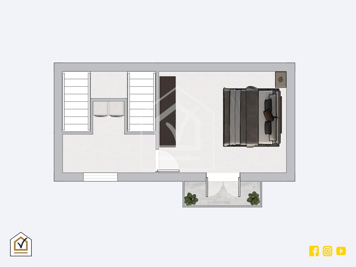 Al primo piano, tramite una scala interna, si accede a una camera da letto molto ampia, ideale per ospitare un letto matrimoniale e arredi aggiuntivi. Da qui si accede a un balcone con affaccio su strada, che dona luce naturale e una piacevole ventilazione agli ambienti.