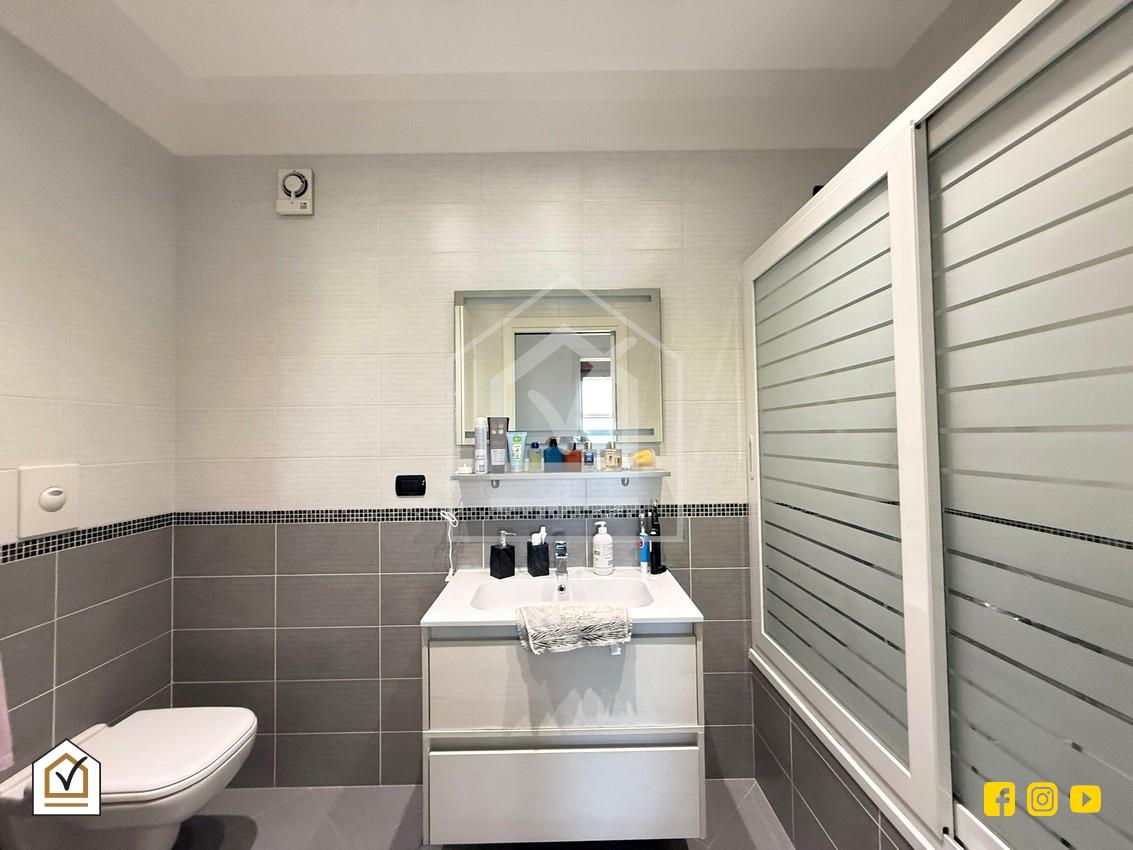 Il bagno, ampio e ben rifinito, è dotato di mobili sospesi, soluzioni di design e una comoda vasca da bagno, perfetta per concedersi momenti di relax dopo una lunga giornata.