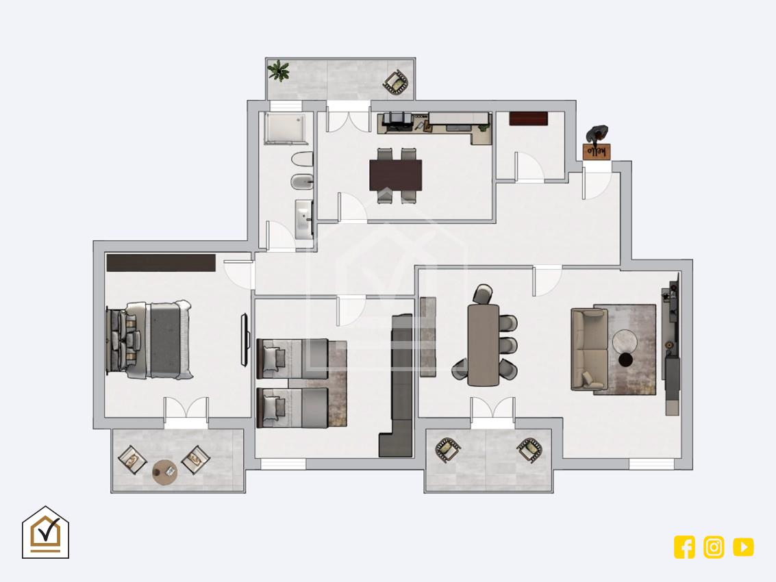 L’appartamento colpisce sin da subito per la sua pianta quadrata, un elemento raro e ricercato che permette una distribuzione degli ambienti estremamente funzionale, senza sprechi di spazio e con una netta separazione tra zona giorno e zona notte.