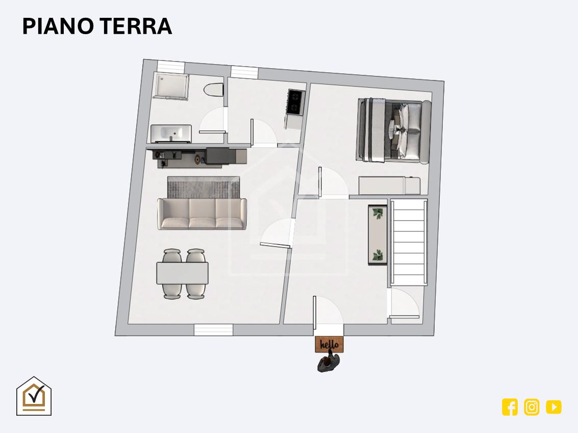 - Piano terra: ingresso ampio che introduce in un accogliente salone, cucina separata, bagno e una spaziosa camera da letto;