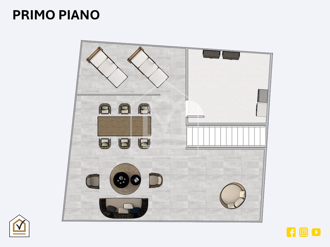- Primo piano: tramite una scala interna si accede al terrazzo di proprietà esclusiva, arricchito da un comodo ripostiglio di circa 12 mq.