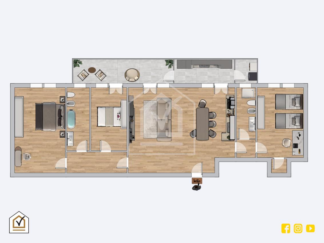 La proprietà si sviluppa su una superficie di circa 135 mq, distribuiti in maniera razionale e funzionale, pensata per offrire il massimo del comfort e della vivibilità in ogni ambiente. L’ingresso introduce direttamente in una luminosa e accogliente zona living, spaziosa e ben strutturata, ideale per ospitare momenti di convivialità in famiglia o con gli amici. La zona giorno è illuminata da due porte finestre che si affacciano su un ampio balcone, soleggiato grazie all’ottima esposizione. Il balcone ospita anche una pratica zona lavanderia esterna.