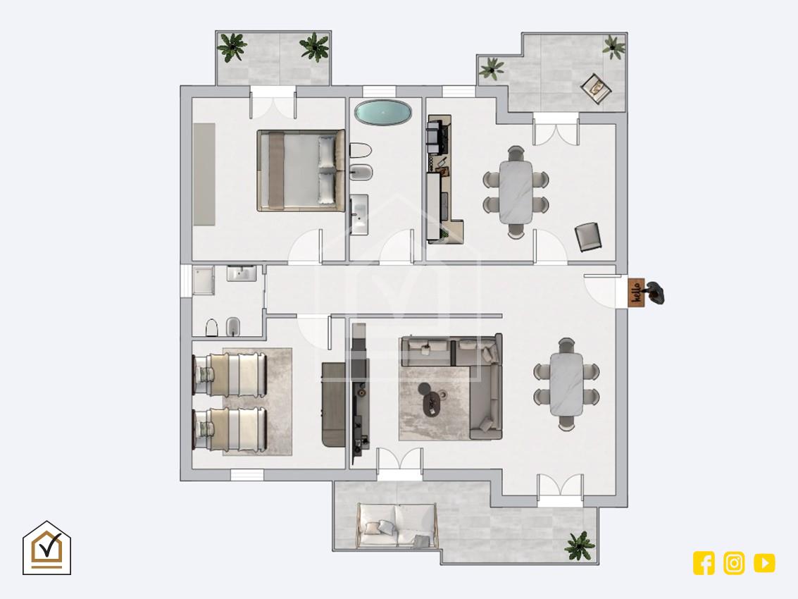 Uno degli aspetti più apprezzabili dell’abitazione è sicuramente la disposizione interna razionale, con una pianta regolare e facilmente arredabile, che permette di sfruttare ogni metro quadro in modo efficiente. La doppia esposizione, inoltre, assicura una ventilazione naturale ottimale e luce solare per gran parte della giornata, contribuendo a rendere ogni ambiente ancora più vivibile e accogliente.