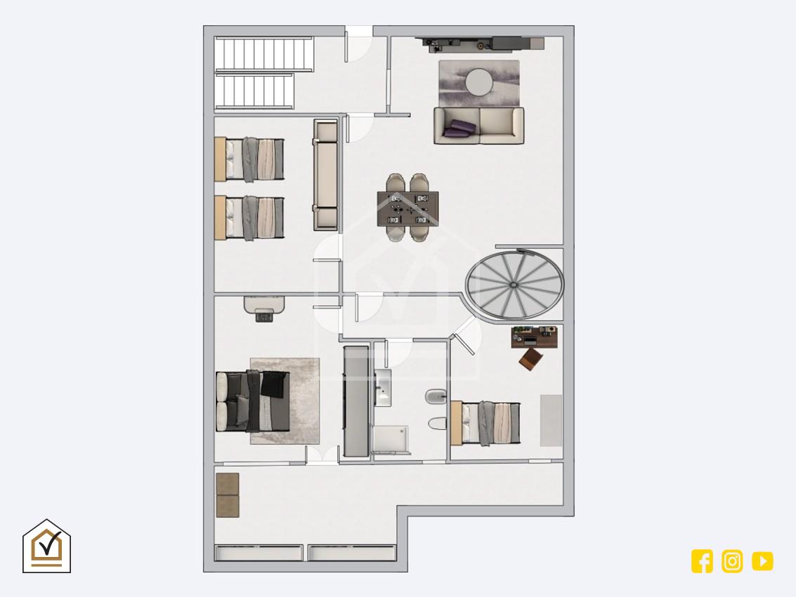 - Piano Seminterrato: Un livello pensato per offrire funzionalità e versatilità, con ampie zona giorno. Sono presenti inoltre tre camere, che possono essere utilizzate anche come stanze per gli ospiti, ufficio o zona relax, e un secondo bagno.