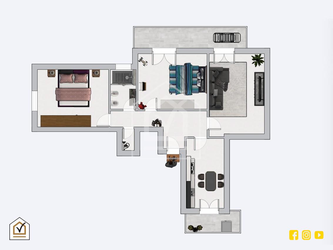 La proprietà immobiliare sviluppa una superficie di circa 95 mq. ed è così strutturata: al nostro ingresso verremo accolti dal disimpegno, che ci guiderà, sulla destra, alla zona giorno composta da cucina abitabile con veranda e ampio salone, con accesso su ampio balcone. Successivamente, sulla sinistra, è presente la zona notte, dove troviamo la cameretta, anch'essa fornita di accesso al balcone interno, bagno finestrato, utile ripostiglio e spaziosa camera matrimoniale.