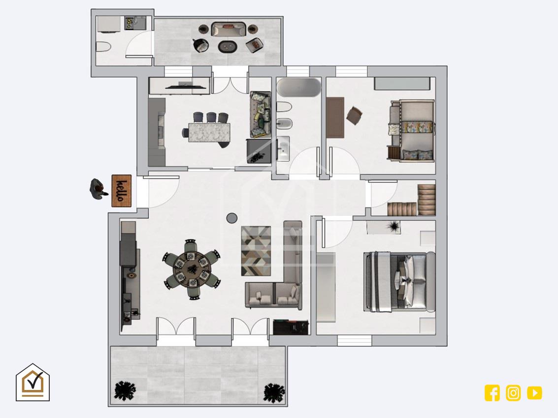 Si tratta di un'abitazione regolarmente disposta su pianta rettagonlare in ottime condizioni con ingresso, doppio salone (dove è possibile creare terza camera da letto), ampia e luminosa cucina, bagno di servizio, due camere da letto, bagno padronale e ripostiglio.