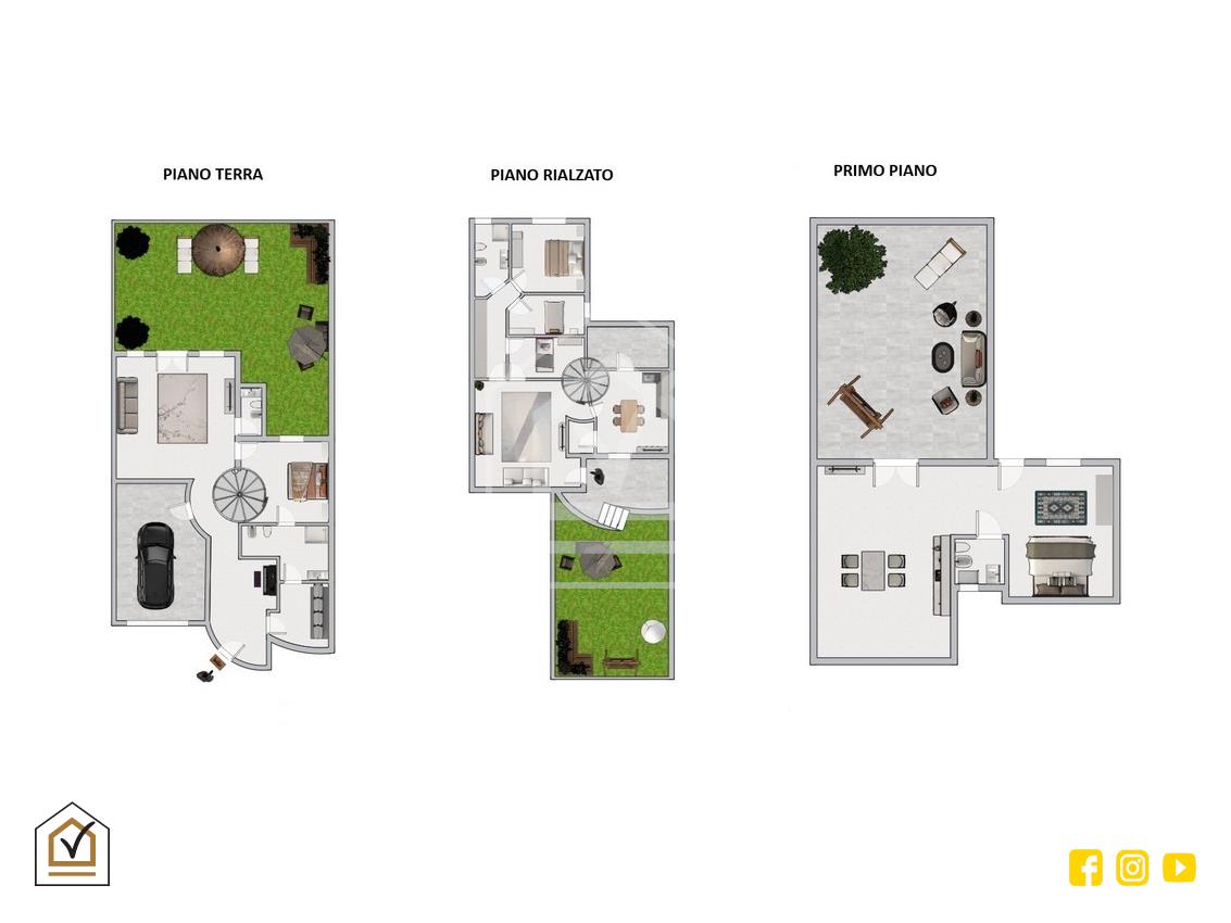 Una raffinata scala a chiocciola conduce al piano rialzato, cuore pulsante della casa, dove si sviluppano ambienti caldi e ben organizzati: una camera matrimoniale, pensata per offrire privacy e comfort, due camerette luminose, un ulteriore doppio servizio, una cucina abitabile perfetta per la vita familiare e un grande salone, ideale per cene e momenti conviviali in un’atmosfera elegante.