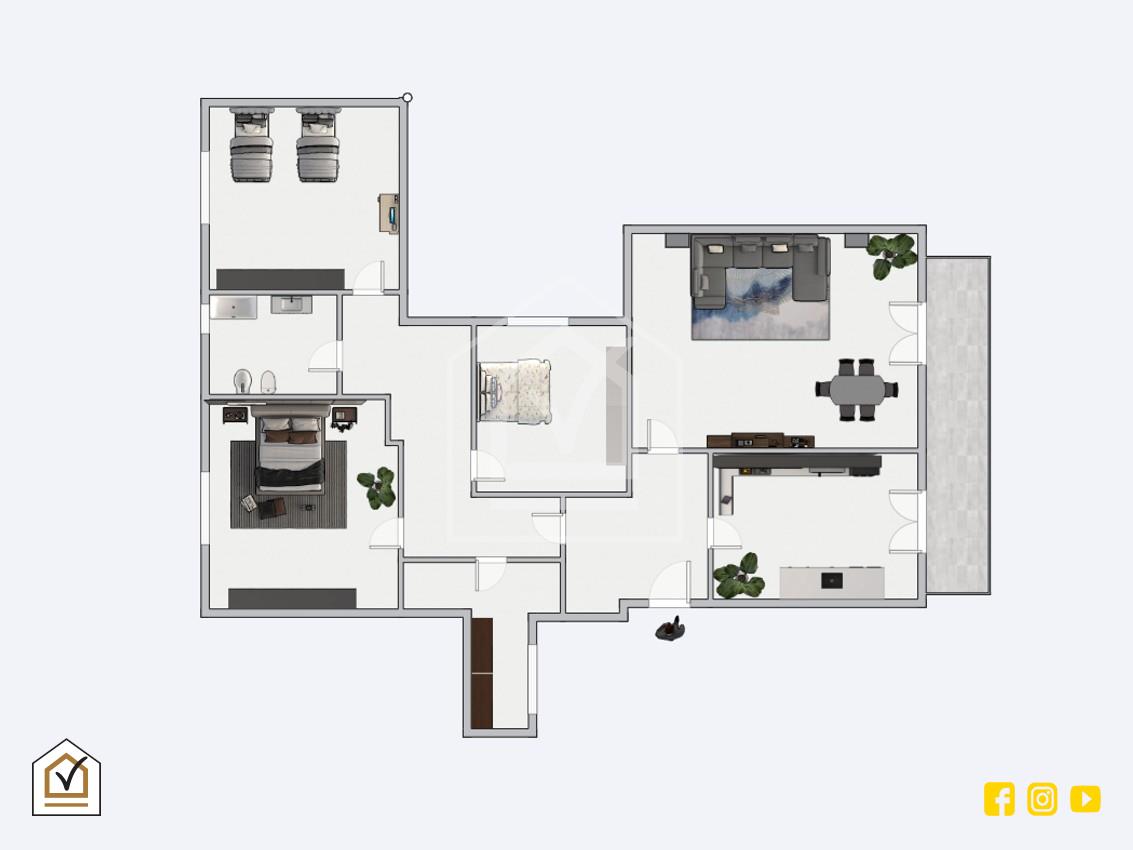 La zona giorno vanta di un ampio metraggio ed è composta dalla cucina e dal salone adiacenti tra loro; apportando delle modifiche è quindi possibile ricreare un moderno open space con doppio accesso al balcone. Proseguendo il disimpegno si giunge alla zona notte composta dalla camera da letto matrimoniale, due camerette ed il bagno. Completa inoltre di utile ripostiglio.