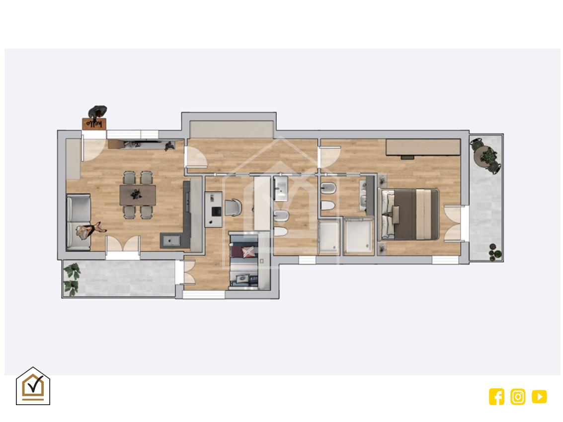 L'ingresso si apre su un'ampia zona living con cucina a vista, progettata per rispondere alle esigenze dell'abitare contemporaneo. La zona notte comprende una camera da letto matrimoniale, una seconda camera da letto e due bagni, di cui uno finestrato con aerazione naturale e l'altro con aerazione forzata.