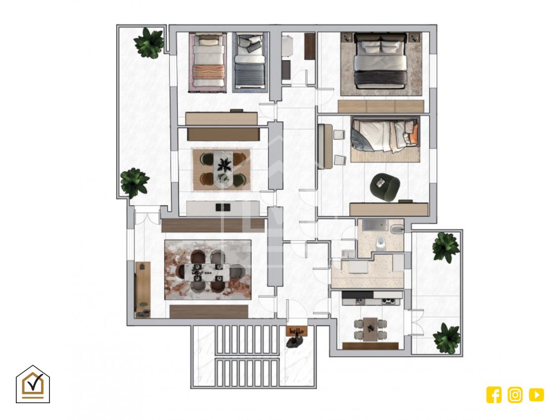 L’immobile, con una superficie interna di 115 mq, è posto al secondo piano di uno stabile senza ascensore. La doppia esposizione assicura ambienti luminosi e ben arieggiati durante tutto l’arco della giornata. La zona giorno gode di due balconi: uno di 7 mq con accesso dal salone, ideale per momenti di relax all’aperto, e un secondo balcone collegato alla cucina, pratico e funzionale per l’uso quotidiano.