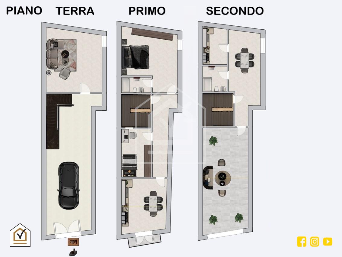 L’ingresso, carrabile e pedonale, conduce direttamente al piano strada, dove il box auto può trasformarsi in una suggestiva tavernetta o in uno spazio multifunzionale. Salendo al primo piano, la zona notte accoglie tre camere e un bagno, ambienti intimi e silenziosi, ideali per la vita quotidiana. L’ultimo livello si apre invece su una comoda zona giorno, dove cucina e zona pranzo dialogano con l’esterno grazie all’accesso diretto al terrazzo, un vero angolo di respiro nel centro della città, perfetto per momenti di relax, convivialità e per godere della vista su Via Manzoni.