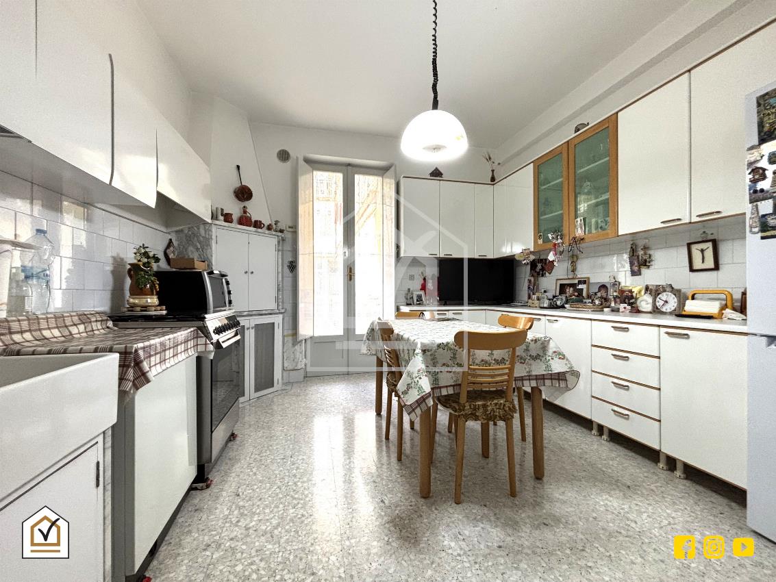 Sulla sinistra troviamo un luminoso salone con affaccio su balcone, mentre sulla destra è presente una cucina abitabile, anch’essa ariosa e ben illuminata dotata di porta finestra con accesso al balcone.