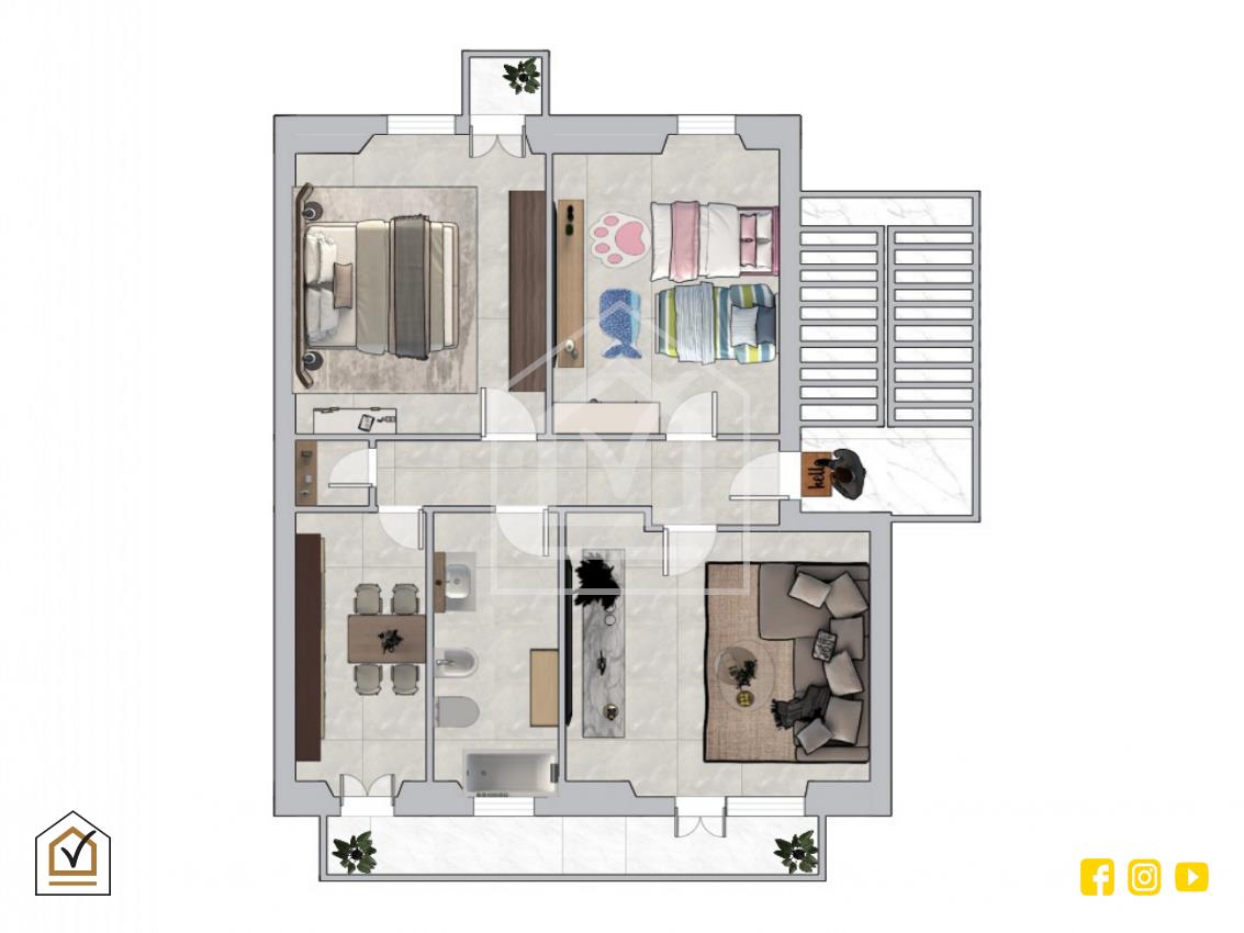 L’immobile si presenta completamente rinnovato, con finiture moderne e una controsoffittatura di design che valorizza gli ambienti, donando uno stile contemporaneo e curato. La disposizione interna è funzionale e ben organizzata: varcata la porta d’ingresso si accede a un comodo disimpegno che distribuisce in modo armonioso tutti gli spazi della casa.