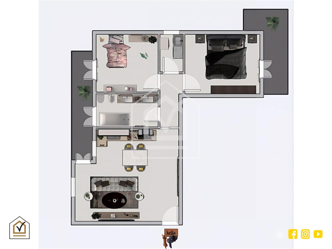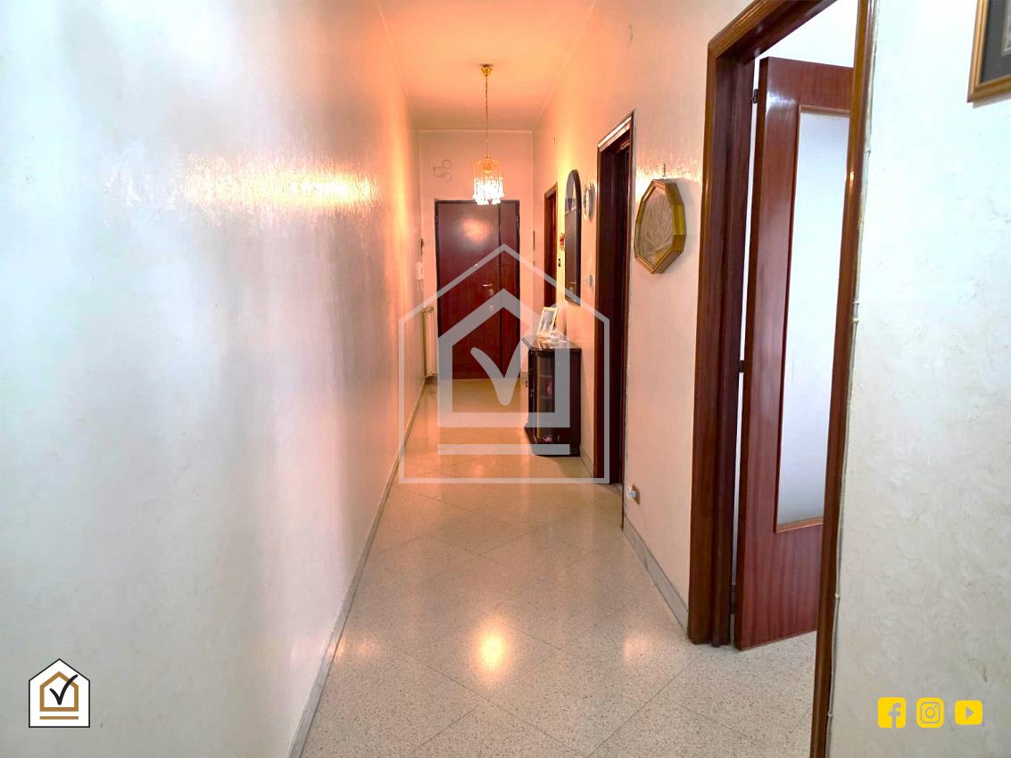 L'ingresso si apre su un ampio corridoio che ospita tutte le camere. A sinistra troviamo una cucina abitabile con doppia finestra, di cui una che accede direttamente al balcone, segue un ampio bagno finestrato con sanitari a pavimento e box doccia. Proseguendo, sempre sulla sinstra, le due camere da letto, di cui una matrimoniale, entrambe che affacciano sul balcone interno. A destra del corridoio, ampio soggiorno illuminato dal balcone su strada principale. Per terminare, in fondo al disimpegno, ripostigilio di generosa metratura, finestrato.