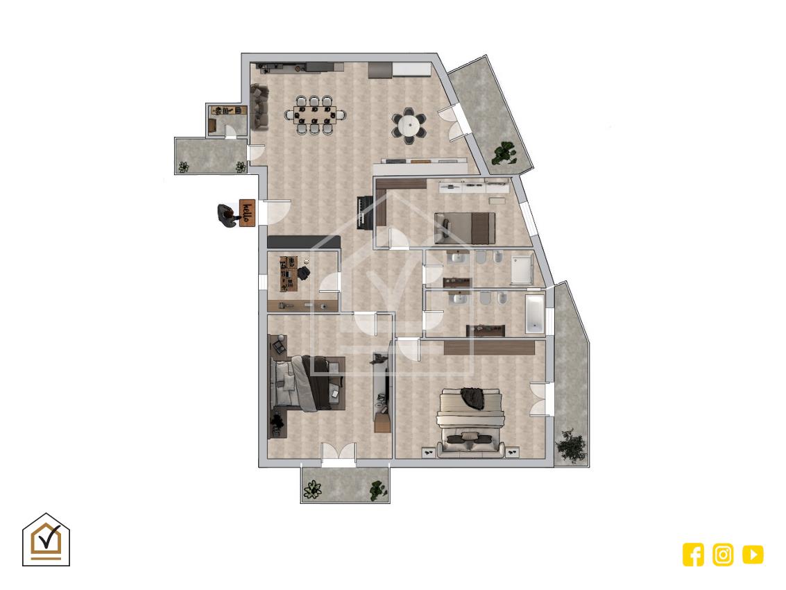 L'ingresso si apre su un ampio e raffinato living con doppia esposizione, un ambiente accogliente e contemporaneo, impreziosito dalla cucina Fracassè, che dona un tocco di stile senza tempo. Un comodo disimpegno conduce alla zona notte, composta da tre camere da letto, di cui due con balcone, due bagni in ottimo stato e un pratico ripostiglio finestrato, facilmente trasformabile in uno studio o spazio smart working.