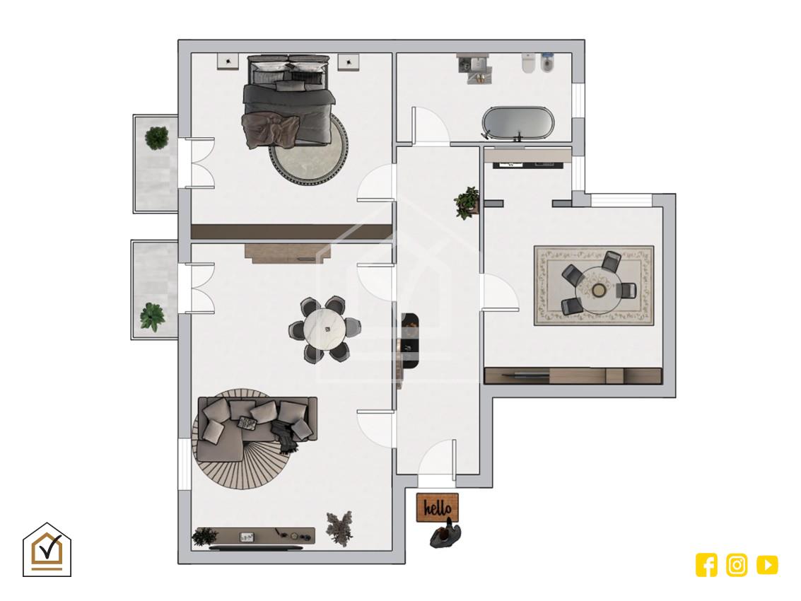L'immoible propone una disposizione funzionale degli ambienti con la possibilità anche di creare un ulteriore camera da letto suddividendo il salone doppio dotato di doppia esposizione esterna. Proseguendo troviamo la sala da pranzo con adicente angolo cottura indipendente, la spaziosa camera matrimoniale con balcone e infine un confortevole bagno finestrato.
