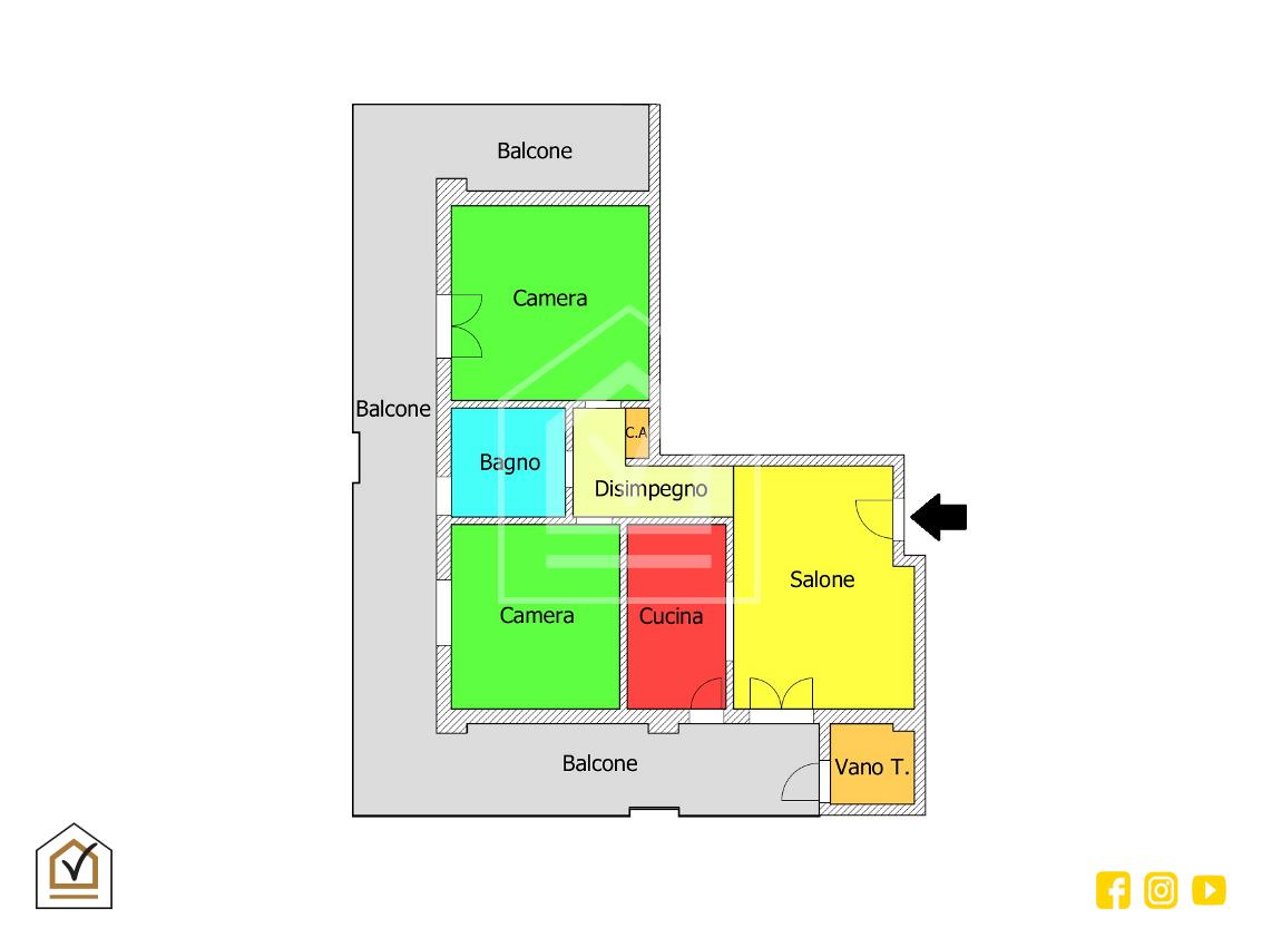 Si sviluppa su una superficie interna di 75 mq ca. alla quale si sommano altri 40 mq ca. di balcone angolare. Varcando la porta d'ingresso blindata si sviluppa la luminosissima zona giorno divisa da una porta in legno a scomparsa dalla cucina. Punto focale è sicuramente la pregiata cucina Berloni dai toni neutri e confortevoli. Proseguendo il disimpegno si viene accolti dalla zona notte composta dalla cameretta di ampie dimensioni completa di letto a ponte con ben 3 letti singoli e dalla scrivania in legno il tutto predoninato dai toni del blu e turchese. Successivamente vi è il bagno completo di lavandino con mobile sospeso, box  doccia e sanitari sospesi. Infine vi è la camera matrimoniale anch'essa molto luminosa e caratterizzata da un ampio armadio a muro.