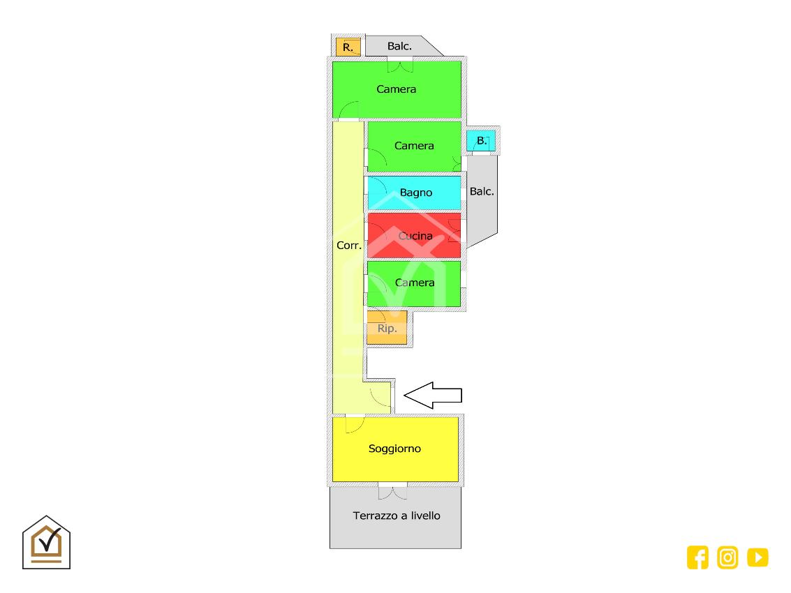 L'immobile ci accoglie con un ampio soggorno con al terrazzo con affaccio sul Viale, proseguendo nel corridoio troviamo un comodissimo ripostiglio, una prima camera da letto, una cucina dalla quale abbiamo accesso al balcone con affaccio interno, unn primo bagno e due accoglienti camere da letto. Entrambe le stanze permettono l'accesso ai due balconi interni di cui uno con annesso ripostiglio e l'altro con annesso bagno.