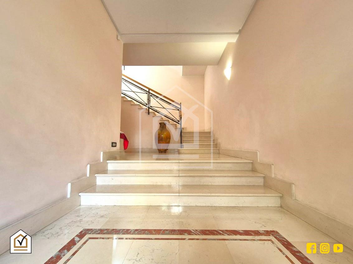 Varcato il portone d'accesso diparte una scala molto rappresentativa nello stile ed eleganza; Essa permette di raggiungere l'ingresso tramite una porta blindata a due ante e non appena entrati, l'attenzione è rivolta agli innumerevoli dettagli e particolari degni di nota: a partire dai preziosissimi e straordinari lucernari realizzati con 9 tessere di vetro disegnate, passando per la magnifica pavimentazione in pietra rosa perlina e parquet doussiè africa fino ad arrivare alle pareti e ai soffitti decorati e alle importanti colonne tuscaniche. Tutto trasmette un senso di lusso, prestigio e ricercatezza!