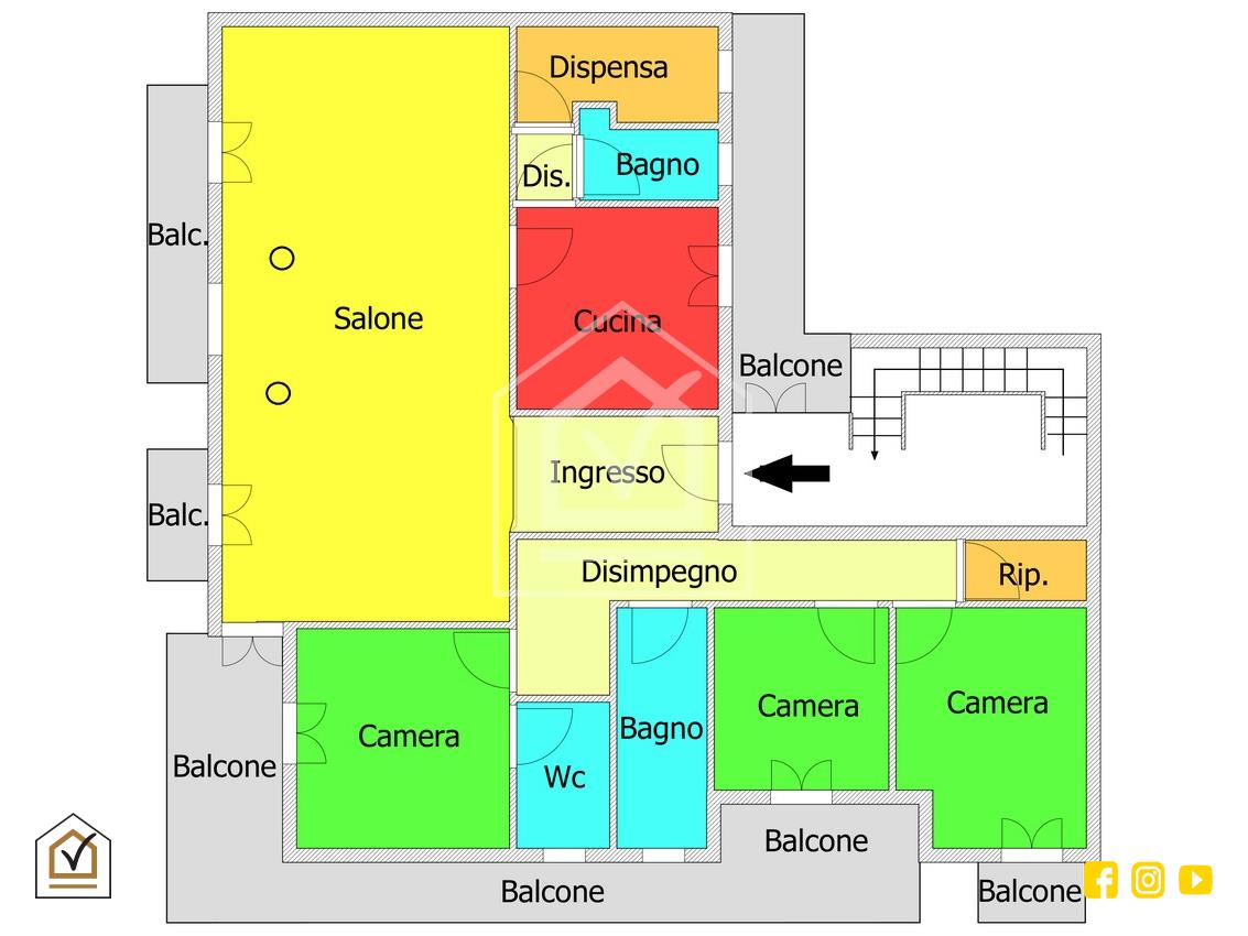 La planimetria regolare e la grande prevalenza di tramezzi garantiscono la possibilità di una diversa distribuzione interna, nonostante oggi il cespite sia ottimamente diviso.