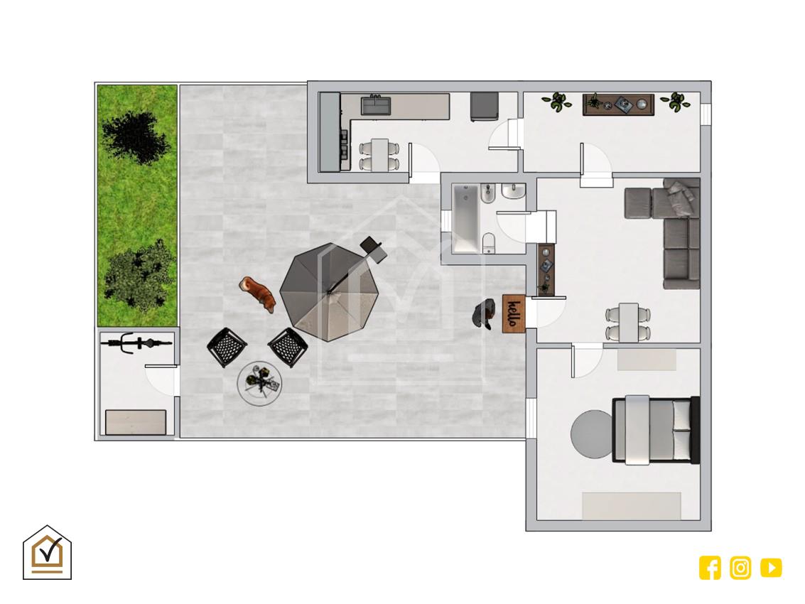 Il fiore all'occhiello di questa abitazione è il suo giardino di esclusiva proprietà, in parte piantumato e in parte pavimentato, ideale per cene, feste e momenti indimenticabili in compagnia di amici e parenti, e per non dimenticare uno spazio dedicato al proprio animale domestico, che sarebbe felice di giocare in totale libertà.