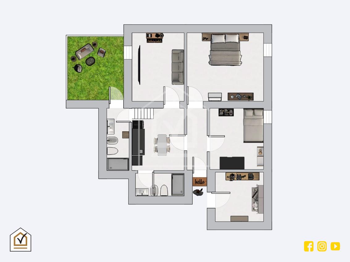 L'interno dell'appartamento è composto da ampie stanze e in particolar modo, l'ingresso garantisce una suddivisione della zona giorno dalla zona notte; sulla sinistra troveremo la cucina abitabile, dotata di due utilissimi bagni e il salone, dal quale si potrà accedere da un giardinetto di proprietà; sulla destra, invece, la zona notte è composta da due confortevoli camere da letto, entrambe dotate di finestra. Infine la soluzione è provvista di comoda cantinola, indispensabile per chi ha necessità di ottimizzare gli spazi.