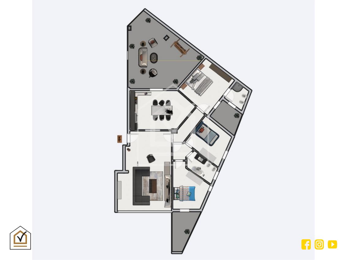 Non appena si varca la porta d'ingresso si è subito accolti in un ampio salone a cui segue una cucina abitabile con affaccio diretto su una pratica veranda coperta. Dal corridoio si ha accesso al bagno padronale e alle tre camere da letto di cui una (quella matrimoniale) dotata di bagno personale e affaccio su una verandina coperta.