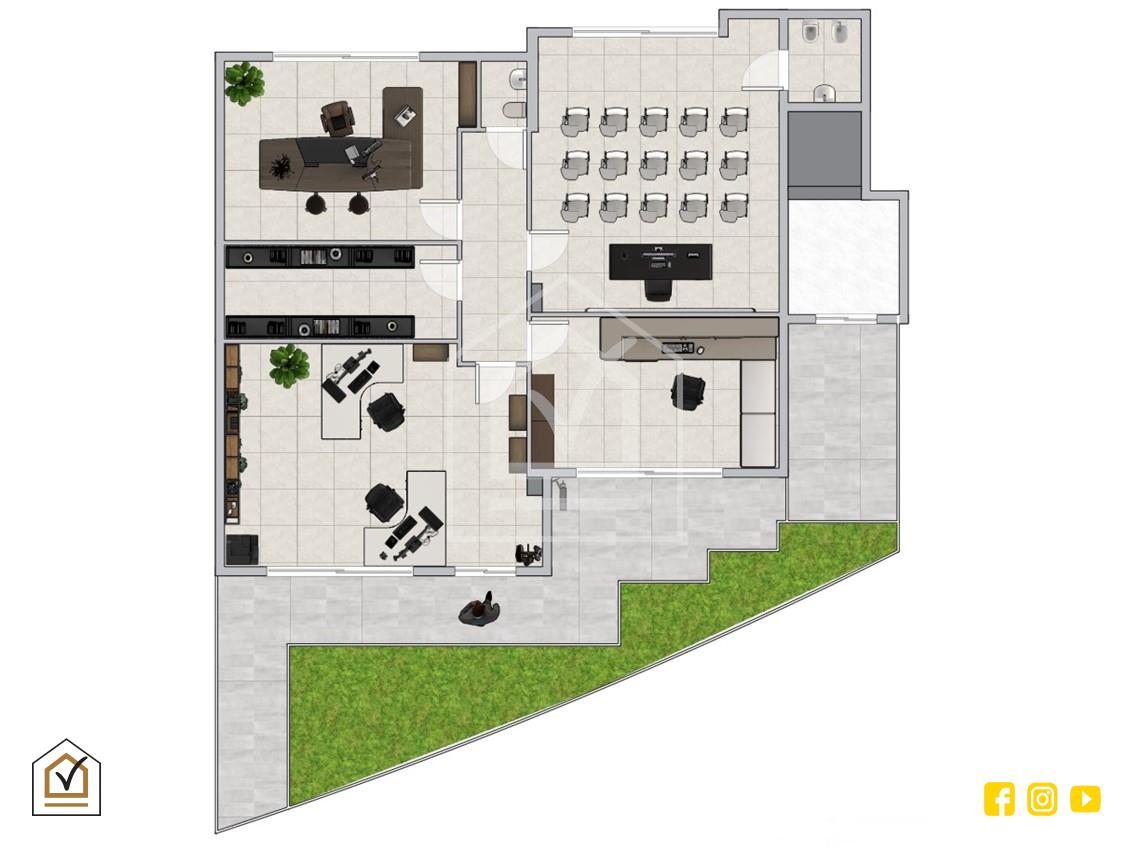 L'immobile comprende inoltre due ampie stanze che possono essere destinate a uffici operativi o sale riunioni, entrambe dotate di finestrature che garantiscono un buon apporto di luce naturale. A completamento della disposizione, è presente una sala briefing, ideale per incontri di lavoro e riunioni con clienti o collaboratori.