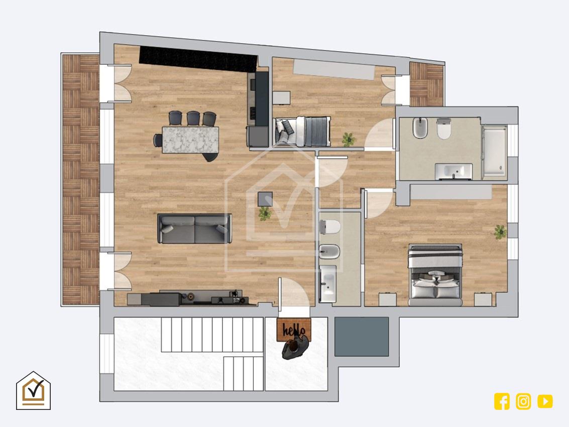 L'appartamento è ideale per chi è alla ricerca di una soluzione chiavi in mano ed è così disposto: ingresso in ampia zona giorno open space composta a sua volta da comoda zona living e cucina, due camere da letto di cui una con bagno in camera e bagno principale.